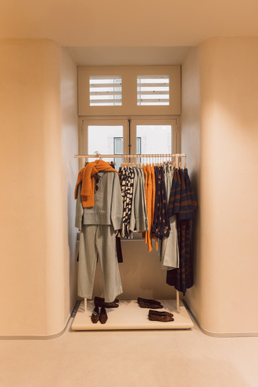 Destaca-se a aposta em linhas suaves e paredes curvas, criando um percurso intuitivo que guia naturalmente o olhar e o percurso entre os diferentes universos da marca. A paleta de tons neutros e os materiais naturais reforçam essa sensação de leveza. Texturas discretas nas paredes, mobiliário em madeira clara e pequenos apontamentos metálicos constroem um ambiente elegante e contemporâneo, onde o produto é o protagonista.